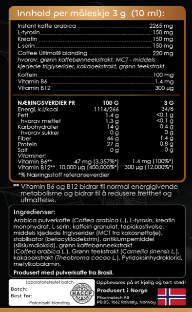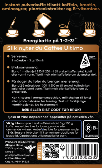 Coffee Ultimo er en unik kaffedrikk utviklet for å øke energinivået. Den inneholder kreatin, L-serin, vitamin B6 og B12, MCT og mer – som støtter fokus, vitalitet og daglig ytelse. En sunn hverdagsdrikk for god daglig helse ☕️